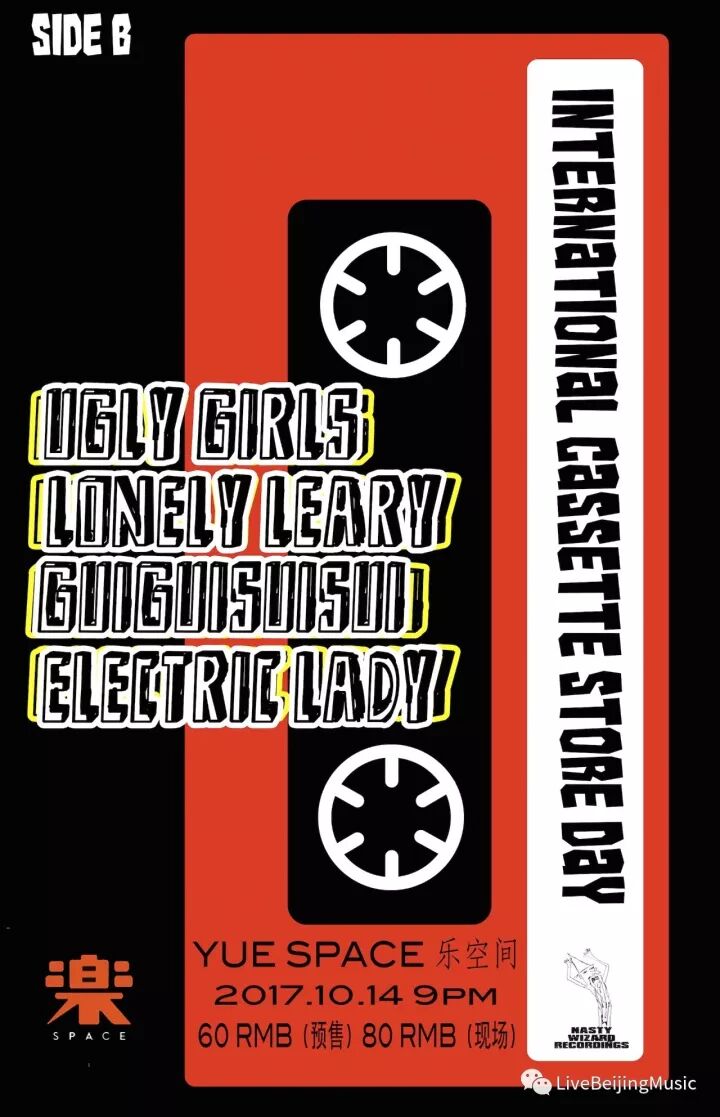 10月14日北京要庆祝今年的国际磁带商店日,所以这活动很牛。在中国上海和广州也想过国际磁带商店日,北京的下流巫师DIY厂牌安排了两个活动,下流巫师先那天下午在YueSpace乐空间办了市集和表演,会有磁带,小型杂志,艺术作品,小吃,以及有两位电音制造人Fløøød和Noise Arcade还有两位民谣歌手Dan Taylor和目迷典的表演,然后那天晚上在乐空间NWR邀请了四支完全不同风格的乐队,来自上海朋克乐队的Ugly Girls,他们最近发了首张非常好听的专辑,Ugly Girls乐队演的时候肯定会让你POGO,兵马司旗下后朋乐队的Lonely Leary,他们明年初准备发很期待的首张专辑,迷幻乐队Electric Lady是一支被低估的现场乐队,如果没有鬼鬼祟祟的话这就不是国际磁带商店日的派对,鬼鬼祟祟的每一场表演不一样,好期待!除了四支很精彩的乐队,会有磁带!磁带!磁带!下流巫师要带来他们的磁带,以及其他来自中国厂牌的磁带!